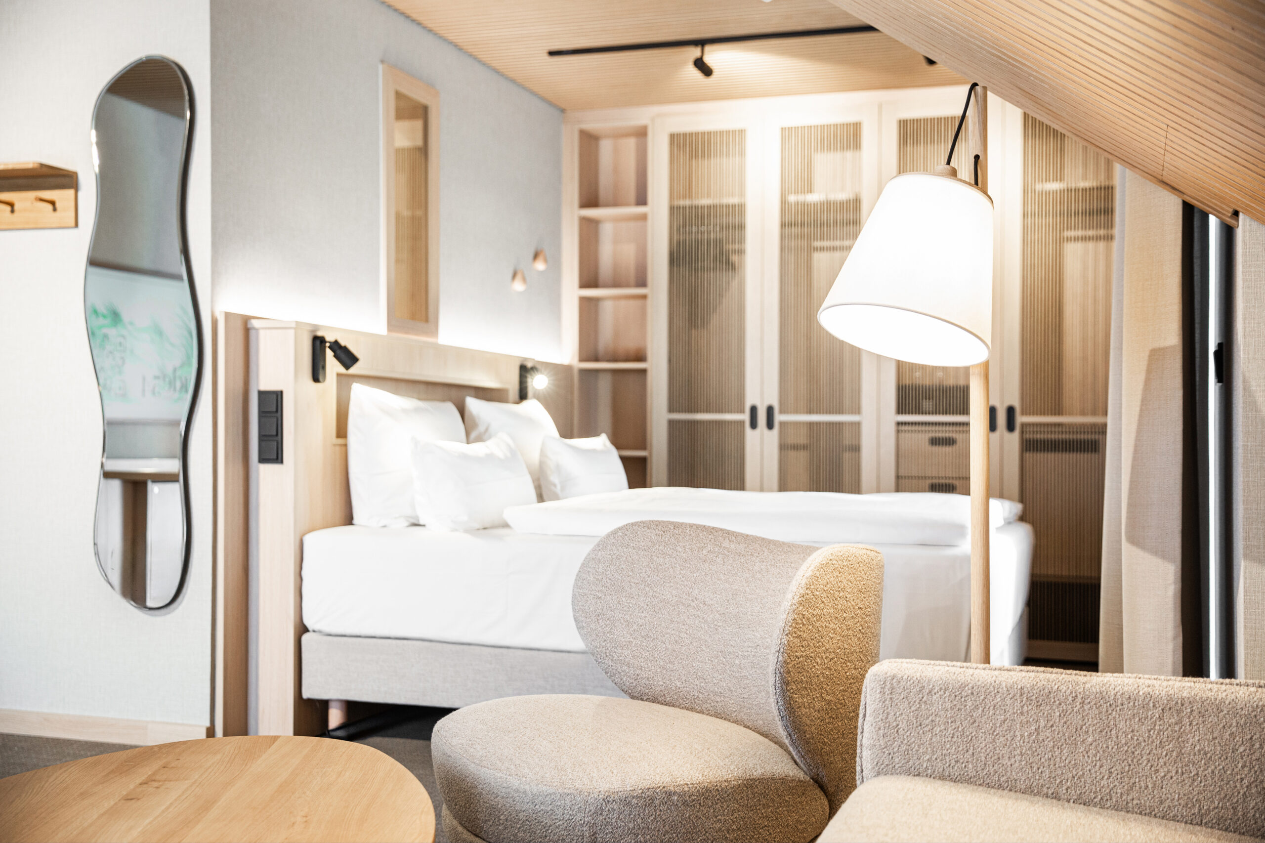 Unsere Buden sind dein ganz persönlicher Rückzugsort. Natürliches Eichenholz, weiche Wellen und griffige Stoffe sorgen für echte Behaglichkeit. Jede Bude ist dein privates Zuhause in St. Peter-Ording – mit Balkon zum Durchatmen, bequemen Betten und bodentiefer Dusche für entspannte Momente.