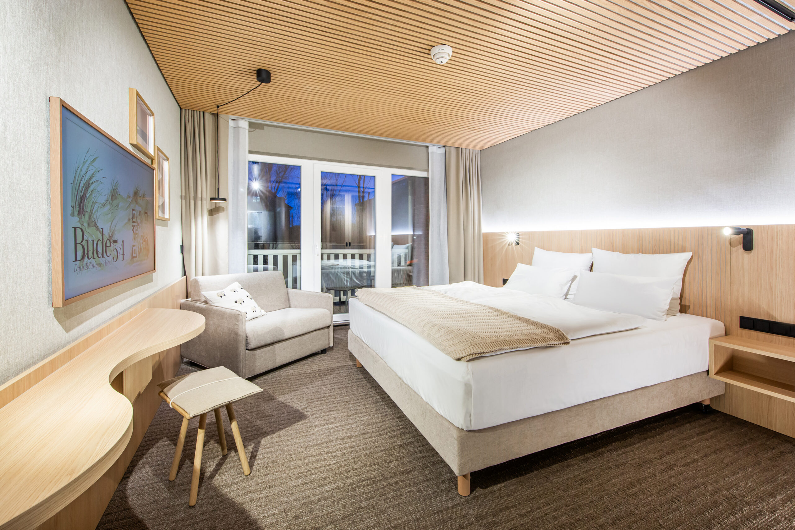 Ob kleiner Familientrip oder die Tour mit den besten Freunden – hier schlaft ihr entspannt zu dritt, ohne auf Style zu verzichten. Das hochwertige Design und der angenehme Teppichboden schaffen sofort eine behagliche Atmosphäre. Neben dem großen Boxspringbett bietet ein praktischer Ausziehsessel den idealen Schlafplatz für die dritte Person im Bunde. Freut euch auf euren eigenen Balkon für die frische Meeresbrise und erstklassige Unterhaltung mit dem Samsung „The Frame“.